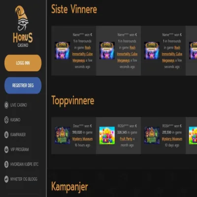 Dette er et solid kasino med solide eiere i ryggen, og en lisens fra Curacao. Her finner du mer enn 4 000 spill fra kjente utviklere i kategorier, som spilleautomater, live casino og bordspill. Det blir mer og mer populært å spille på casino uten registrering. Dette er dog problematisk i Norge for øyeblikket, men vi har likevel mange casinoer som tilbyr raske ordninger og Horus er et av disse! Her finner du også et hav av bonuser, og du kan blant annet se frem til påfyllingsbonuser i helgene. Horus har også en VIP-klubb hvor du må bli invitert inn i, men her venter det mange spennende fordeler. Velkomstbonusen deres er omsetningsfrie, men det er satt en grense på hvor mye du kan vinne med bonuspengene. Velkomstbonusen er tredelt og den er på til sammen 10 000 kr og 125 gratisspinn.