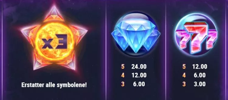 Hjulene er satt pÄ en bakgrunn som forestiller verdensrommet og bak hjulene finner du en planet som ser ut som jorden. Det er solen som er wild-symbolet, og det kan dekke hjulene og kommer samtidig med ulike multiplikatorer. Ellers er det krystaller som er de hÞyest betalende symbolene etterfulgt av 7-tallene. Lander du 5 krystaller pÄ en betalingslinje fÄr du 16 ganger innsatsen igjen, mens 5 7-tall er verdt 8 ganger innsatsen. NÄr det gjelder de andre symbolene er det litt vanskelig Ä se om de skal representerer planeter eller verdifulle edelstener. Uansett kommer de i ulike farger, som grÞnne, oransje, rÞde, gule og fiolette. Klarer du Ä fÄ til 3 omspinn og fÄ den maksimale multiplikator pÄ 9 ganger kan du hente ganske store utbetalinger.