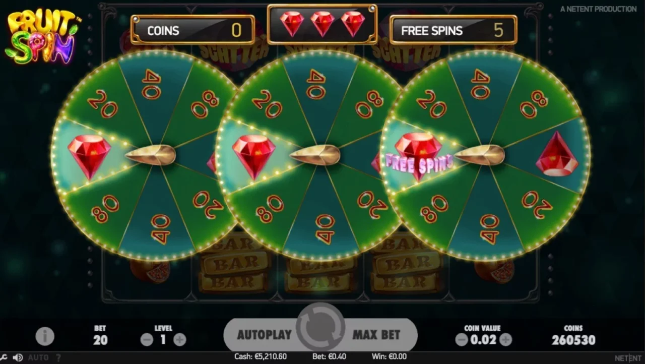 Det er som sagt Lucky Wheels som er den funksjonen som kan aktivere gratisspinnene i Fruit Spin. For å aktivere Lucky Wheels må du først lande scatters i hovedspillet. Du vil få 1 spinn på tre lykkehjul for hver rad av de 3×3 scattersymbolene som er synlig på hjulene etter et spinn. Du kan derfor altså få 3 spinn på hvert av de 3 lykkehjulene, dersom du lander hele 3×3 scatters på hjulene.