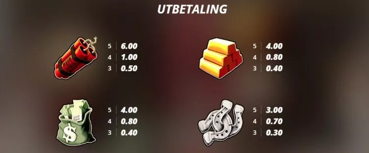 Symbolene du ser på hjulene inkluderer de vanlige kortsymbolene som ess, konge, dronning og knekt. I tillegg finner du pistoler, hestesko, pengesekker, gullstenger og dynamitt, og disse fungerer alle som de høyest betalende symbolene. Dynamittkubbene er de symbolene som betaler mest, og her får du 0.6x innsatsen for 5 like på en betalingslinje. Det er derfor ikke vanskelig å gjette seg til at det ikke er her de store premiene ligger. De dukker opp når du får bruke de spesielle funksjonene.
