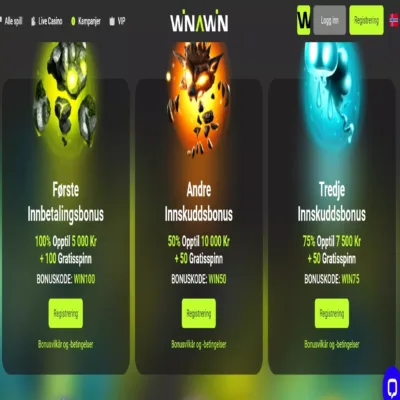 - 1. bonus: 100% opp til 5000 kr + 100 gratisspinn (Bonuskode: WIN100)
